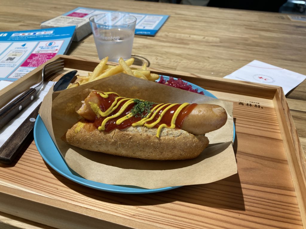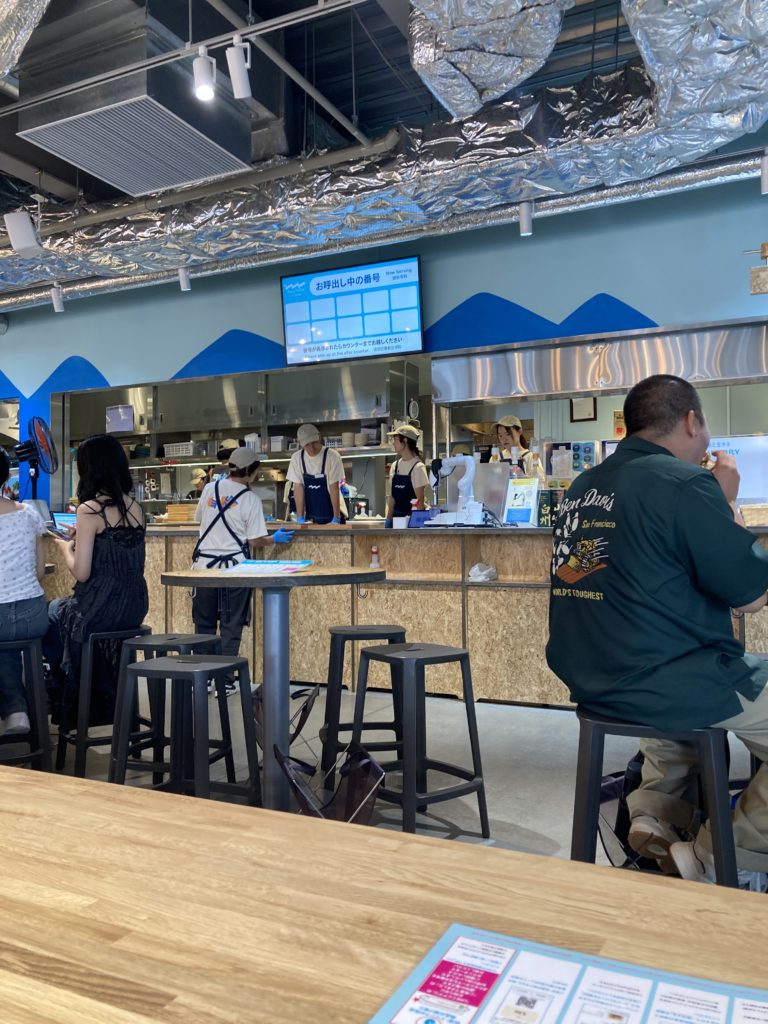 昼ごはんにホットドッグを注文しましたが、ここは全てオンライン注文でテーブルのQRコードをスマホで読み、そこから希望のメニューを選び、そのあとにクレジットかPaypayの支払い決済まですべて完了するとやっと注文番号があらわれ、その番号がお呼出し番号表示板に現れると取りに行くシステムでした。私と同年配以上の人はみな近くのスタッフに聞いておられました。